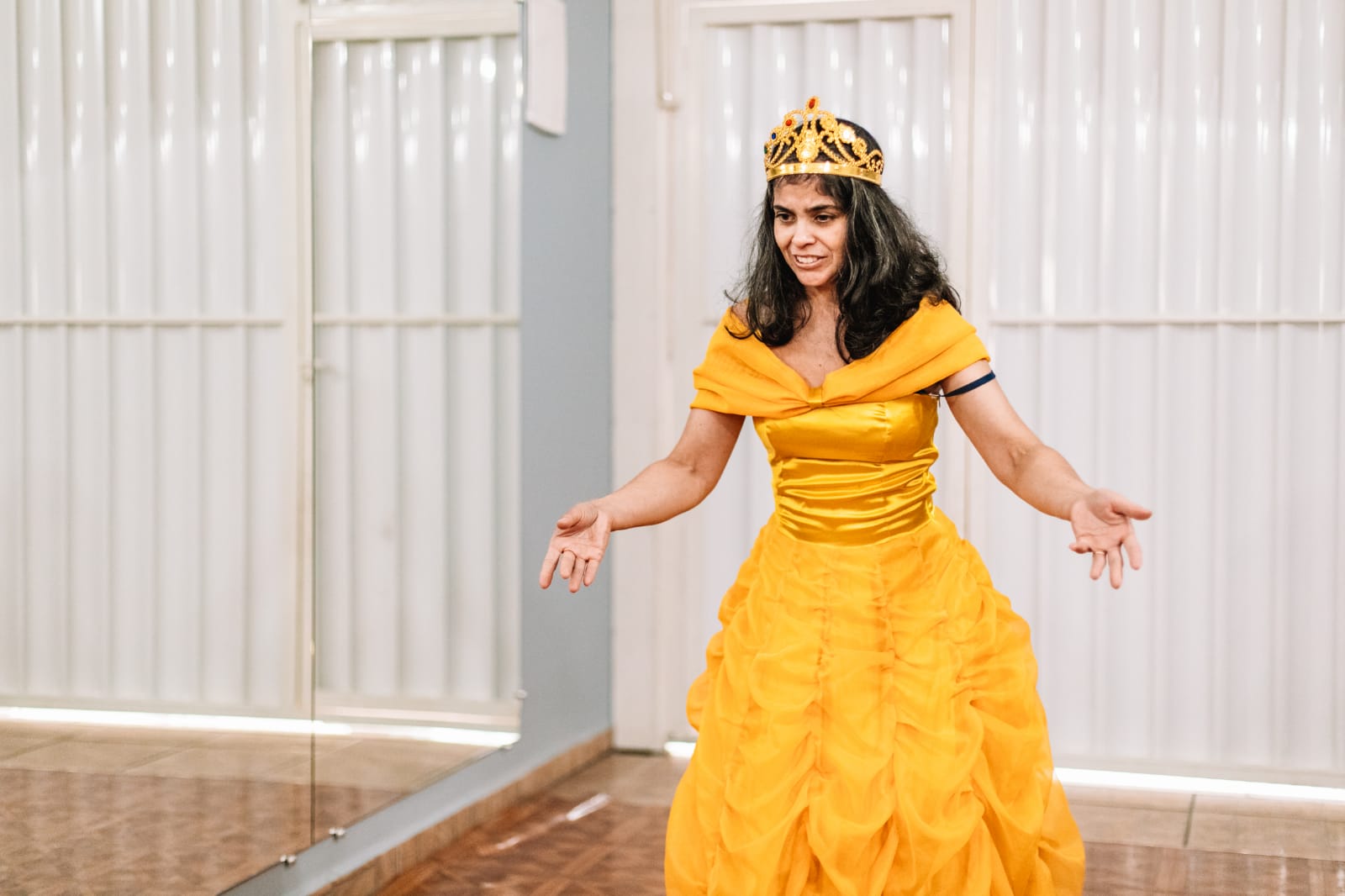 O edital pedia um figurino, o que quase desencorajou Anne. No entanto, ela lembrou-se do vestido da Bela que ela mesma havia confeccionado. Com coragem, decidiu participar do mini curso de teatro, inicialmente acreditando que não subiria ao palco.