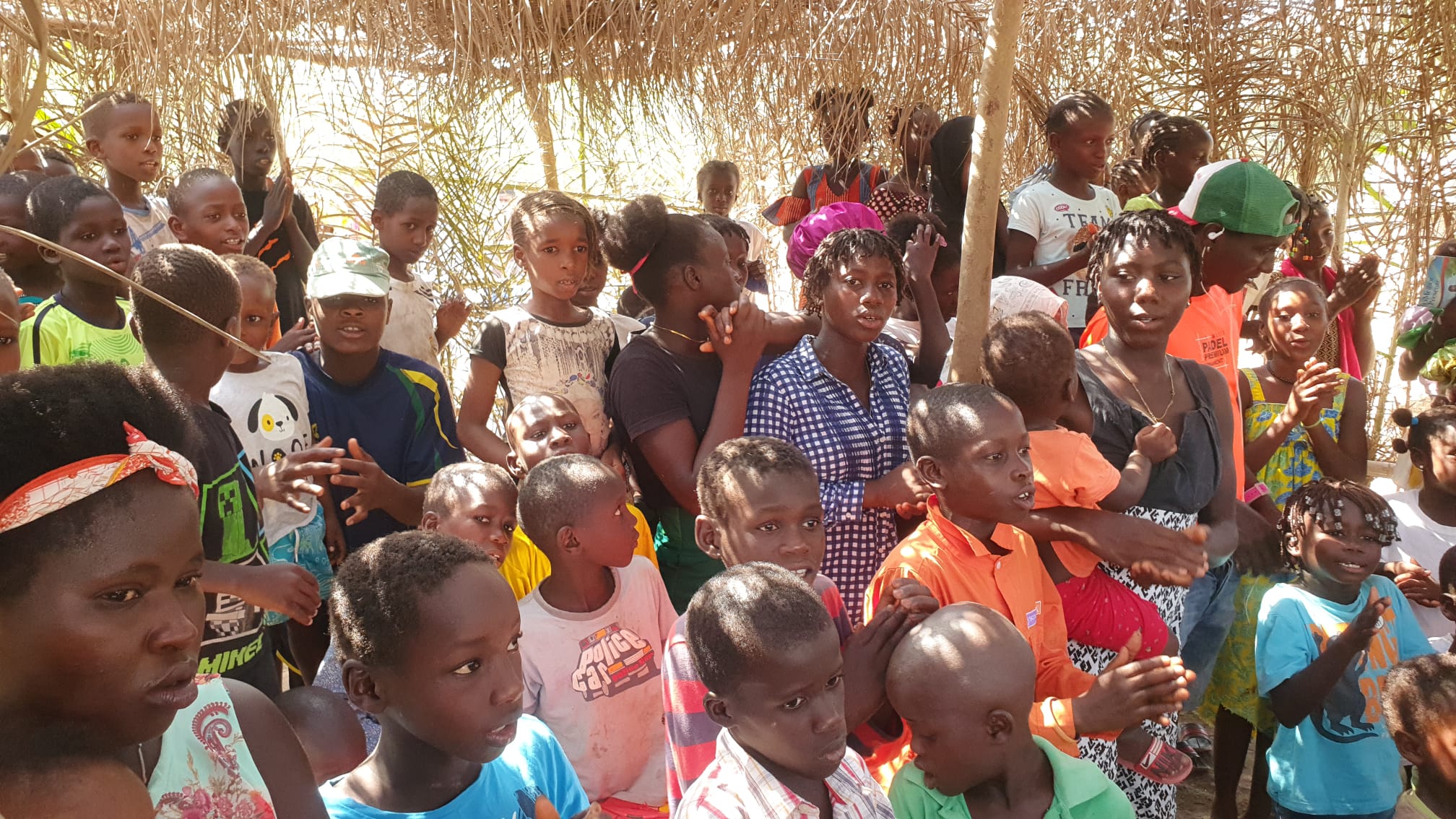 Alunos da aldeia de Poel na sala de aula de palha. Logo teremos ali uma linda escola